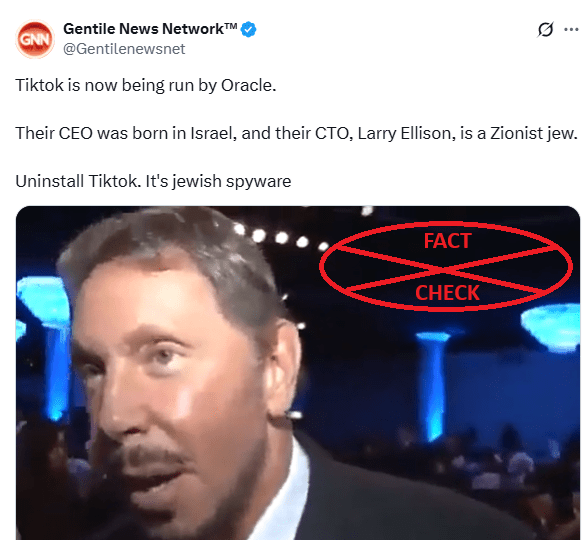 Recently several social media users have claimed that TikTok is now operated by Oracle, whose CEO is a Zionist. Verified X user Gentilenewsnet’ made such a claim on September 24, 2025 urging users to uninstall the app, labeling it “Jewish spyware.”