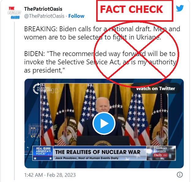 The tweet said, ”BREAKING: Biden calls for a national draft. Men and women are to be selected to fight in Ukraine” and added, “The recommended way forward will be to invoke the Selective Service Act, as is my authority as president.” The post also carried an image of President Biden making an address.