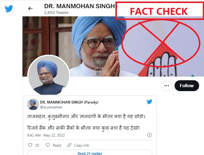 A Twitter post with a screenshot of a tweet criticising the current state of Indian banks is being shared widely despite the fact that it was from a parody account of former Prime Minister Manmohan Singh. The post said in Hindi: “Leave aside what is inside the Taj Mahal, Qutub Minar and Gyanvapi. Look at what’s left inside the Reserve Bank and the rest of the banks!”