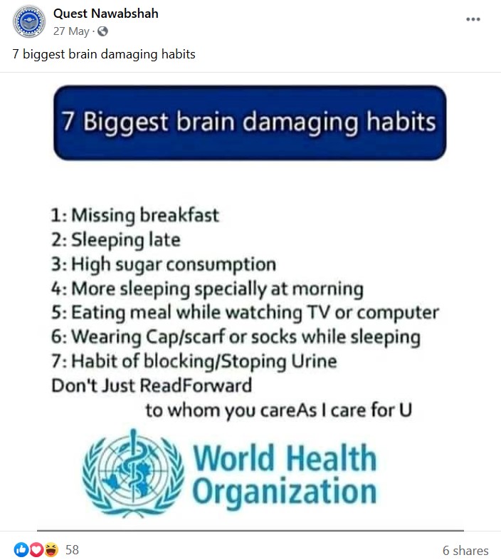 A post is doing rounds on social media with a claim that the World Health Organization (WHO) has laid down seven habits as the biggest brain damaging habits. The alleged list includes:
