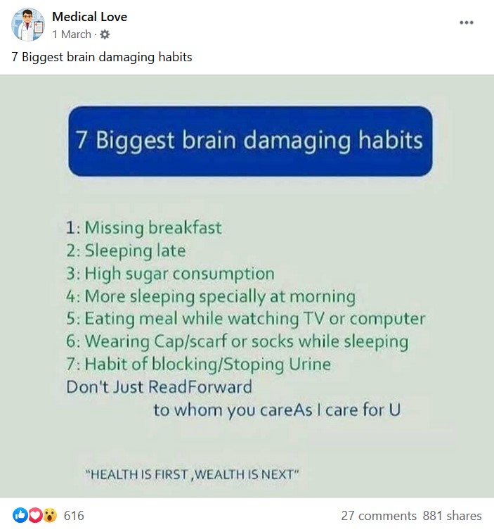 Claim: World health Organization listed out these ‘brain damaging ‘ habits.