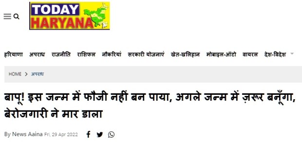 One such claim shows a paper clipping in Hindi that said an army aspirant killed himself in Haryana. “Father, I could not become a soldier in this life, but I’ll surely become one in my next,” read the caption in Hindi and is being shared here and here, with a potential to go viral.