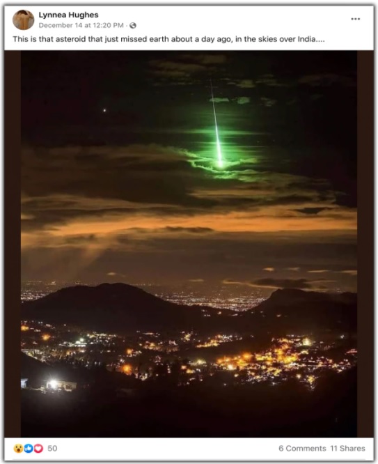 An image of a green streak of light in the night sky is being shared on WhatsApp and other social media platforms with the claim that it is an asteroid that flew-by the earth just missing to hit our planet. The message further claimed that “This is that asteroid that just missed earth about a day ago, in the skies over India”.