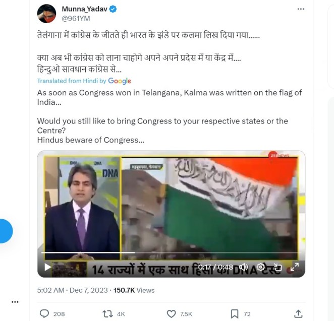 तेलंगाना में कांग्रेस के जीतते ही भारत के झंडे पर कलमा लिख दिया गया……