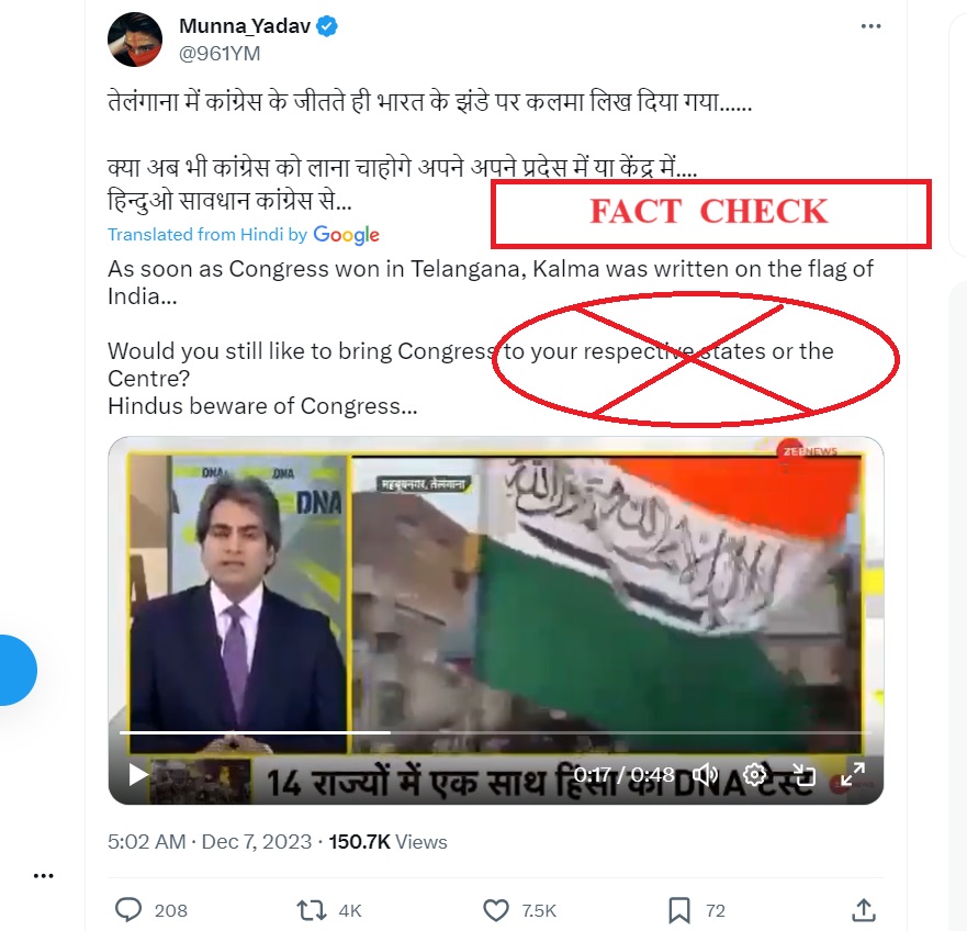 After the election results in Telangana, a video is going viral on social media with a claim that during the victory march of the Congress party, supporters were displaying the flag with Kalima or the Muslim confession of faith, written on it. The claim reads: