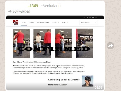Recently, a video claiming to be Aryan and taken while he was in an inebriated state at the airport and urinating in the open at queue is going viral on WhatsApp. It is followed by another image that has the wording “CONFIRMED” stamp with a logo of ALT News, a fact checking organization.