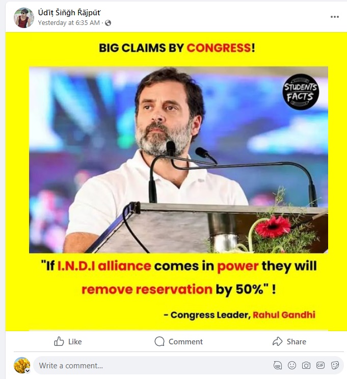As reservation is taking center stage in the upcoming Lok Sabha elections in India, several misleading statements are appearing on social media. One such poster had a statement that Rahul Gandhi announced that the I.N.D.I.A. alliance would reduce reservations by 50% if they are voted to power.