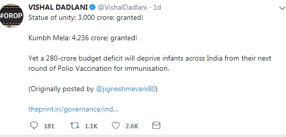 Soon misinterpretations took several formats going to the extreme of saying the fiscal budget deficit this year may not afford enough polio vaccines for the country’s children. Maharashtra Congress has captioned it in large comparing it with other expenditure as below. Many have trolled the shortage of vaccines as seen below: