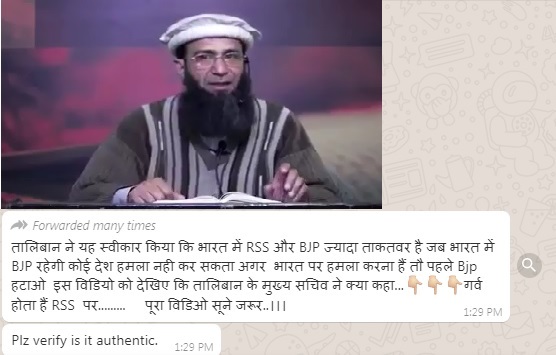 The video is going viral on WhatsApp with a claim “तालिबान ने यह स्वीकार किया कि भारत में RSS और BJP ज्यादा ताकतवर है जब भारत में BJP रहेगी कोई देश हमला नही कर सकता अगर भारत पर हमला करना हैं तौ पहले Bjp हटाओ इस विडियो को देखिए कि तालिबान के मुख्य सचिव ने क्या कहा…??????गर्व होता हैं RSS पर……… पूरा विडिओ सूने जरूर..।।।” [“Taliban has accepted that RSS and BJP are more powerful in India: Taliban chief secretary said. As long as RSS and BJP are there in India, no (foreign) one can invade the country. If they want, remove BJP first. See this video…Proud with RSS. Listen to the entire video!”] It was also retweeted on Twitter several times.