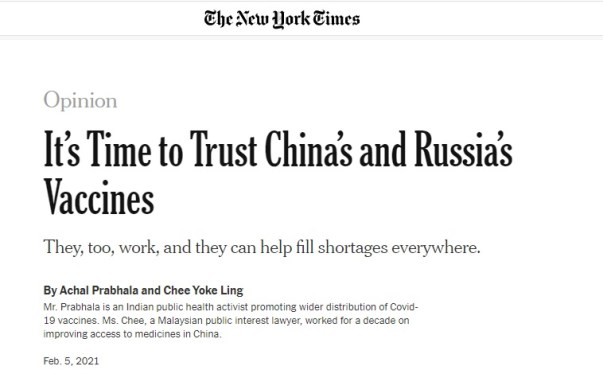 1. The New York Times, which often makes anti-China remarks, published an article about two weeks ago headlined: ‘It’s Time to Trust China’s and Russia’s Vaccines’,