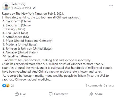 A claim has been making rounds in social media stating that the Chinese vaccines ranked as top four of the ten global vaccines developed for Covid-19. The claim cited news articles published in October 2020 in US newspaper The New York Times and German broadcaster Deutsche Welle to support their claim that these publications have endorsed the ranking of top ten vaccines.