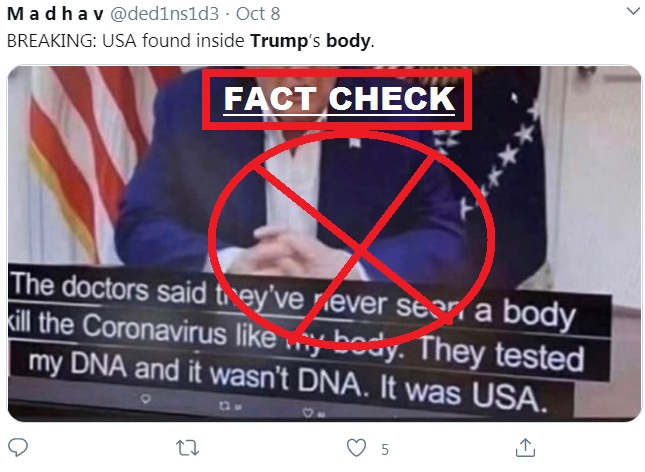 A viral image on social media is going viral with a quote attributed to US President Donald Trump. The image has a message below the President’s photo and reads: “The doctors said they’ve never seen a body kill the Coronavirus like my body. They tested my DNA and it wasn’t DNA, it was USA.”