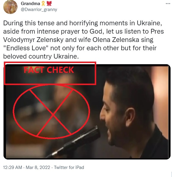 The video shows two singers singing Diana Ross and Lionel Richie’s 1981 famous song “Endless Love” with a cpation that said: “Ukraine President Volodymyr Zelensky and wife Olena sing “My Endless Love” not only for each other but for their beloved conutry Ukraine.” The video is being shared on Twitter here and here and also on Facebook.