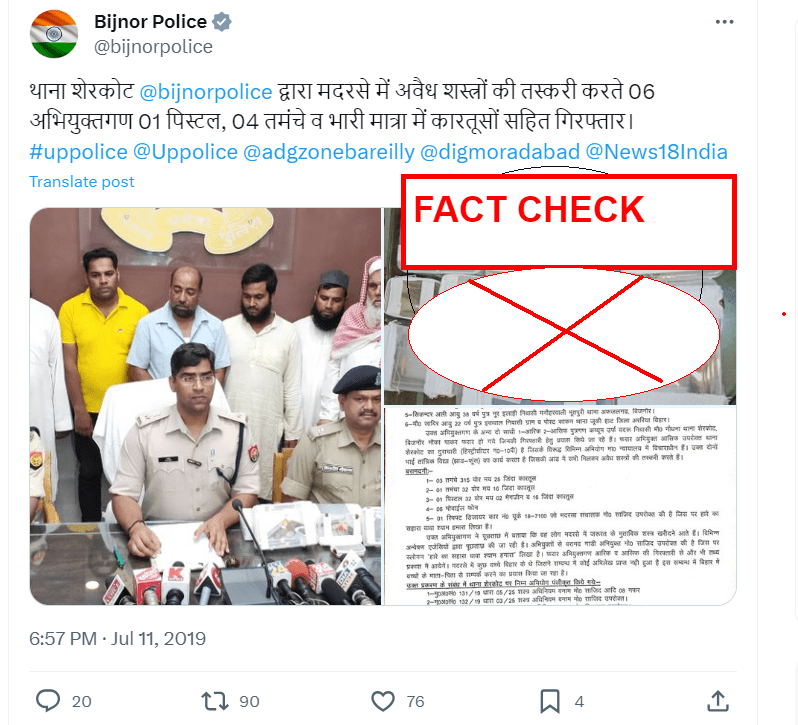 The first picture of the culprits standing in a police station is not from Coimbatore. A reverse image search revealed that the image was from Bijnor, Uttar Pradesh. Bijnor Police had tweeted this image when they had nabbed people who were accused of smuggling illegal arms into the madrasa in Sherkot, Uttar Pradesh. The police had recovered one pistol, four handmade guns, pistols, and many cartridges. The incident took place in July 2019.