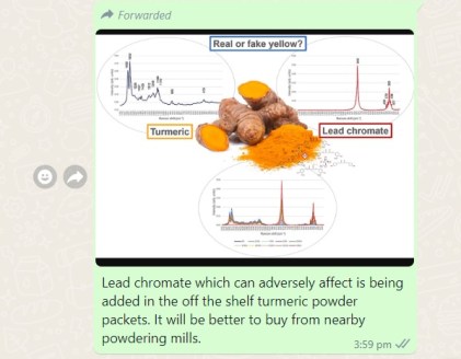 A viral message claims that the turmeric that is used in food contains lead chromate which makes it look more yellow. The forwarded message also contains an infographic that details the use of lead chromate in turmeric.