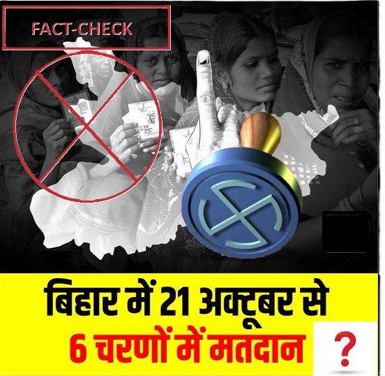 विभिन्न सोशल मीडिया माध्यमों में यह दावा पूरी तरह से भ्रामक और असत्य है कि बिहार विधानसभा चुनाव छह चरणों में 21 अक्तूबर से 20 नवंबर के बीच होंगे और मतगणना 24 नवंबर को होगी। pic.twitter.com/o3OfnO7EfQ