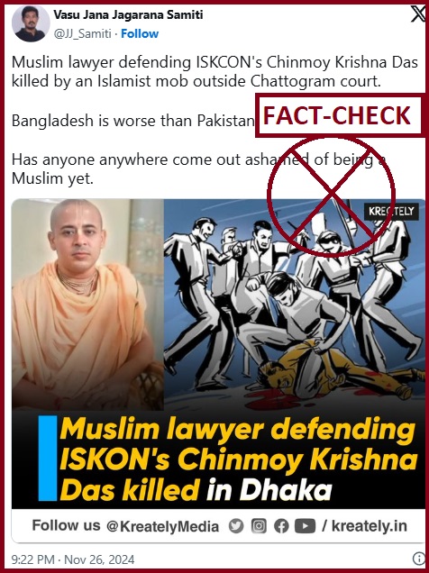 Several social media posts are being shared on social media claiming that the lawyer defending former ISKCON (International Society for Krishna Consciousness) priest Chinmoy Krishna Das Brahmachari in Bangladesh was killed in Bangladesh in recent riots in Chattogram, which reportedly erupted following Das’s arrest.