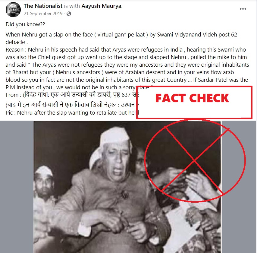 A photo of India’s first Prime Minister Jawaharlal Nehru has surfaced on social media with a claim that Nehru was publicly slapped in 1962 at an event by the chief guest, Swami Vidyanand Videh, after he said that ‘Aryans were refugees in India’.