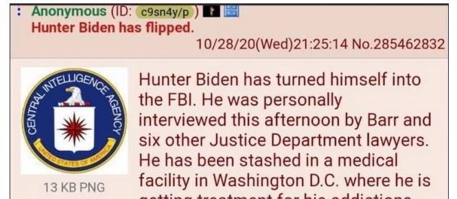 A message on October 28, 2020, just a week before the November 3 elections, stated that Biden had turned himself in to the FBI and “flipped” on his father, former vice president Joe Biden. The message posted on dubious image board 4chan’s /pol/ (Politically Incorrect) has been picked by a so-called news outlet and social media users here, here and here. This story stemming from 4chan’s /pol/ comes close on the heels of a hoax claim on Hunter Biden’s death that also originated here and later gone wild and debunked by Digiteye team last week.