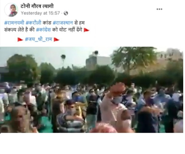 A video on social media is going viral claiming that Rajasthan voters woun’t vote for Congress after the recent communal violence in Karauli. The caption in Hindi reads: “Following the Ram Navami incident in Karauli, Rajasthan, we pledge not to vote for Congress.” It was shared widely on FACEBOOK and on Twitter.